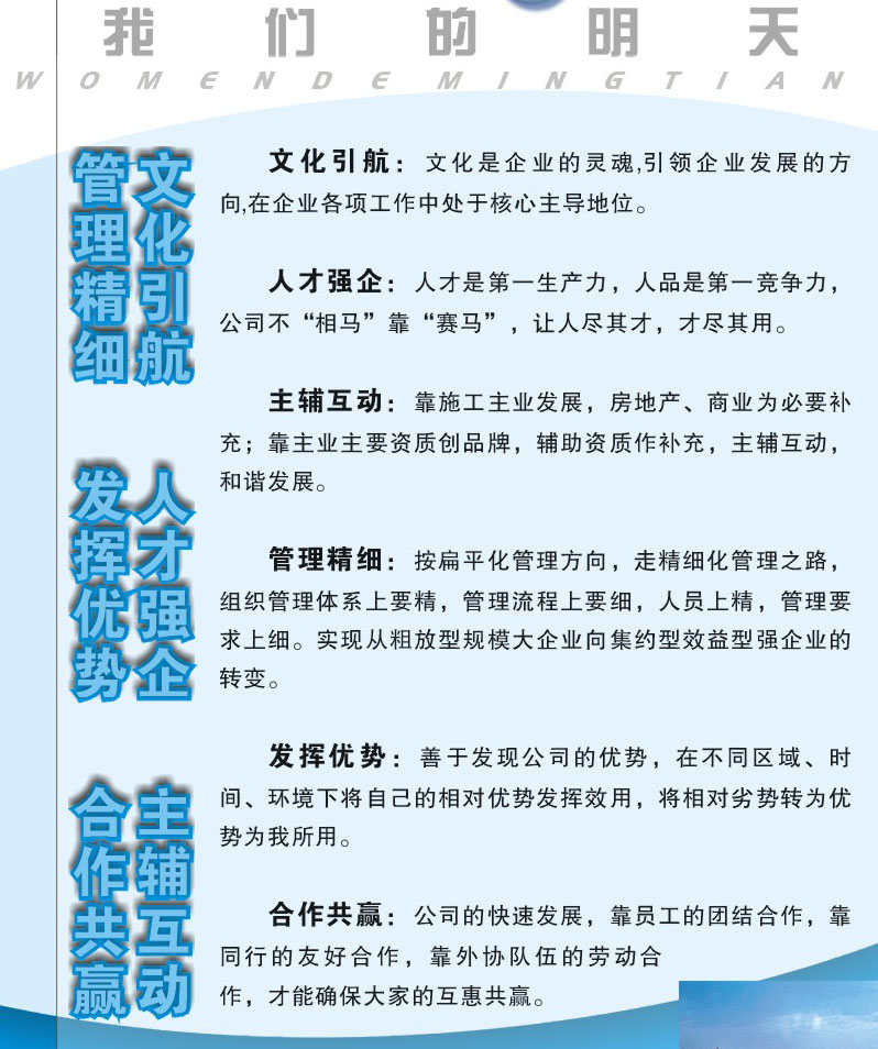 4、企業文化是企業發展戰略規劃的重要組成部分,公司的發展戰略是:文化引航、人力強企、主輔互動、精細管理、發揮優勢、合作共贏。